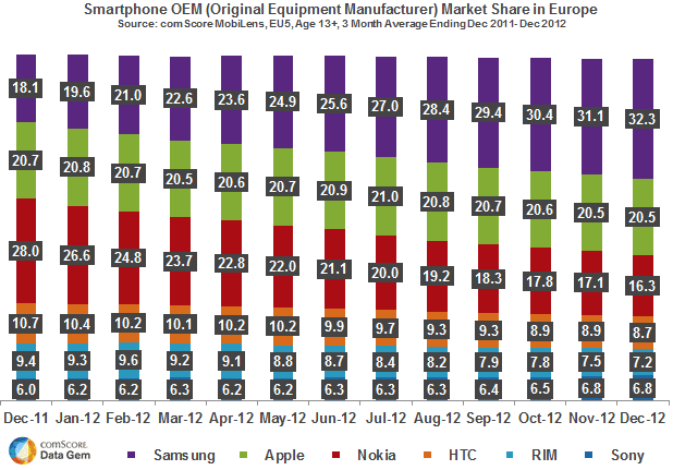Samsung au top en Europe. Comscore vient de publier une étude exhaustive sur les fabricants de téléphones en Europe. On y apprend notamment que Samsung est en constante progression depuis décembre 2011. Ce qui permet au géant de Séoul de largement devancer Apple, qui reste stable. Nokia est en chute libre.