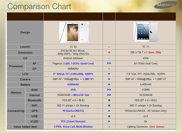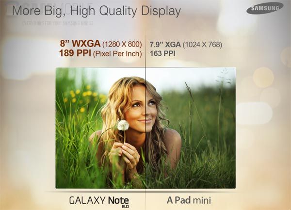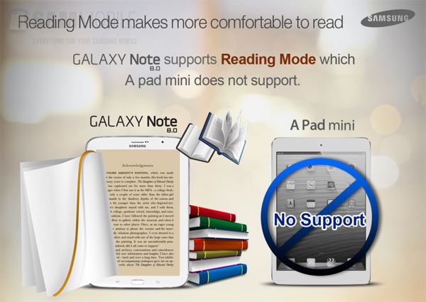 Le Note 8.0 mieux que l’iPad Mini. Samsung a eu la drôle d’idée de publier plusieurs visuels pour expliquer les raisons qui font que sa tablette réduite est plus performante que celle d’Apple. On vous laisse vous faire votre propre opinion, mais la différence de mémoire vive est impressionnante (2 Go contre 512 Mo).