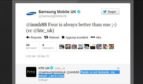 En effet, les deux constructeurs se sont envoyés des tweets assassins (qui ont été depuis supprimés) concernant leur Samsung Galaxy S4 et HTC One.