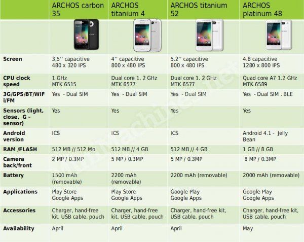 Nouveaux Android Phone d’Archos. Le constructeur français s’apprêterait à lancer quatre smartphones fonctionnant sous Android. Ce n’est qu’une rumeur pour l’instant, mais elle paraît loin d’être inimaginable et voici les spécifications supposées de ces quatre appareils tricolores. Comme on peut le voir, ces téléphones ne devraient pas être trop cher et on pourrait en savoir plus d’ici la fin du mois.