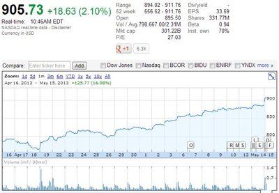 Jamais Google n’avait été aussi haut dans l’histoire du Nasdaq. L’action du moteur de recherche vient de dépasser les $900, à quelques minutes de la conférence I/O. Il y a trois mois, l’action battait déjà le précédent record en atteignant les $800. Google est inarrêtable.