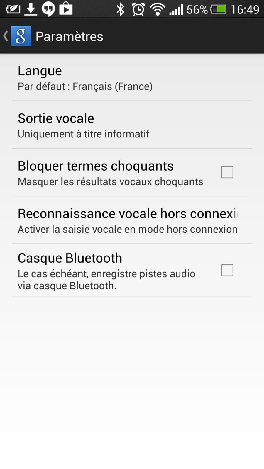 Je n’ai pas l’option « Reconnaissance vocale hors connexion »qui suit l’option « Bloquer les termes choquants ».Que dois-je faire ?