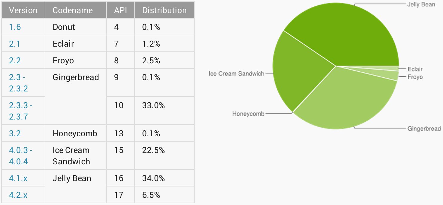 Android est un système qui évolue très rapidement et un grand nombre de versions est dans la nature. Il est intéressant de voir comment se répartissent ces versions Android, surtout pour les développeurs par exemple qui veulent apprécié au plus juste s’ils peuvent se permettre ou non d’être incompatible avec une mouture.
