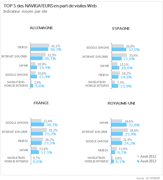 Google Chrome s’empare enfin de la première place en Europe avec 27,2 % d’utilisation, très légèrement au-dessus d’Internet Explorer (26,4 %) et Firefox (21,3 %), qui reculent tous les deux.