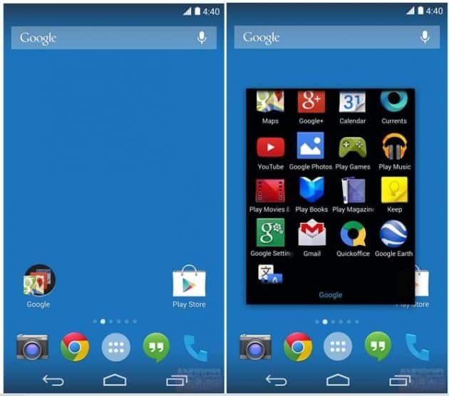 Selon les images, on voit que les dossiers peuvent maintenant défiler horizontalement, Google Now peut être un widget, l’ajout de widget ne sera possible que depuis le bureau, …