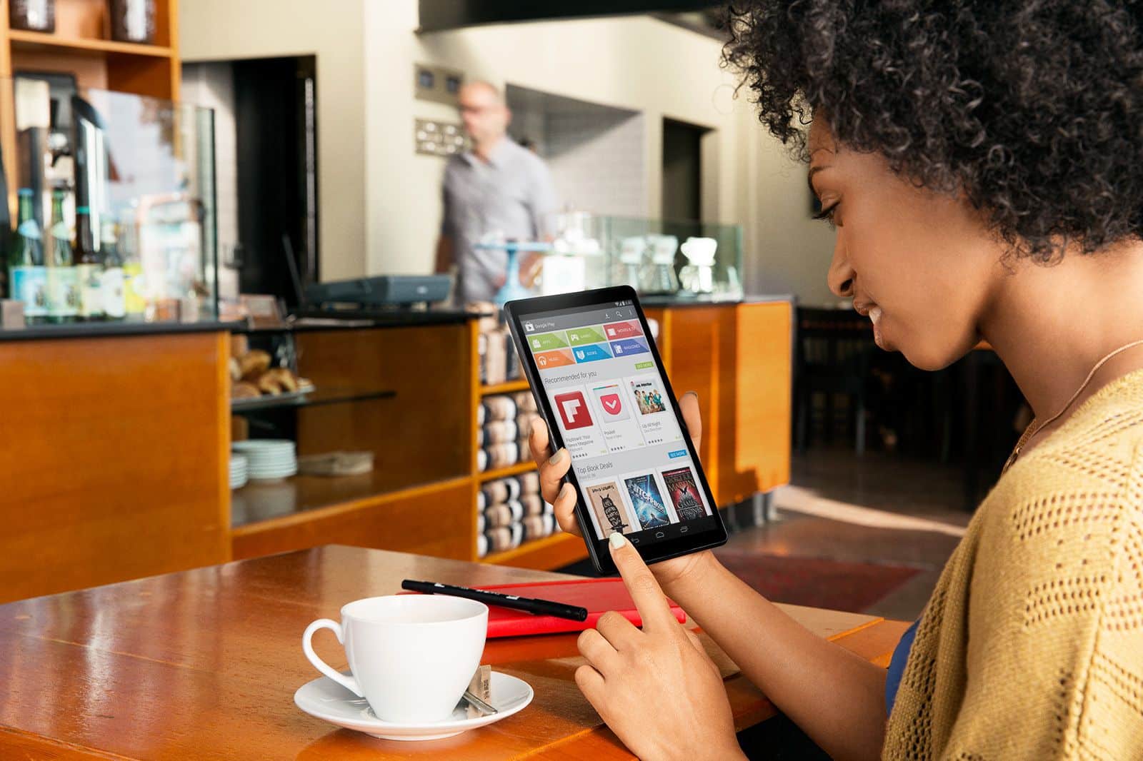 En effet, sur l’une des illustrations, on remarque une femme tenant une tablette Nexus inconnue. Si la Nexus 7 a le même design, les bords sont ici plus fins que sur le modèle que l’on connait.