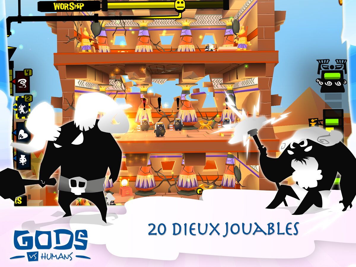 Gods VS Humans vous propose d’incarner Dieu (environ 20 divinités) et de gérer les ardeurs des humains qui essayent de construire une tour pour rejoindre le monde des Dieux.