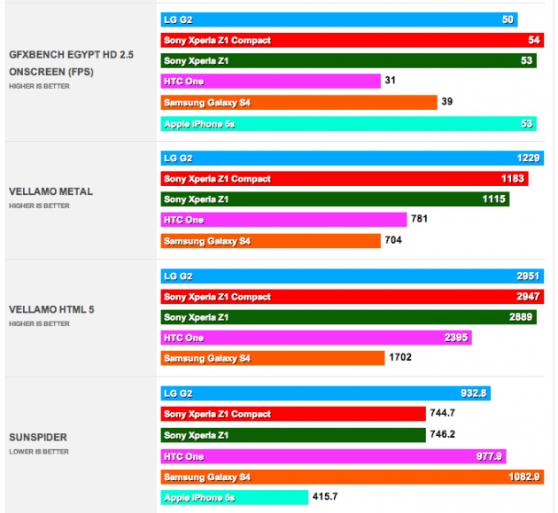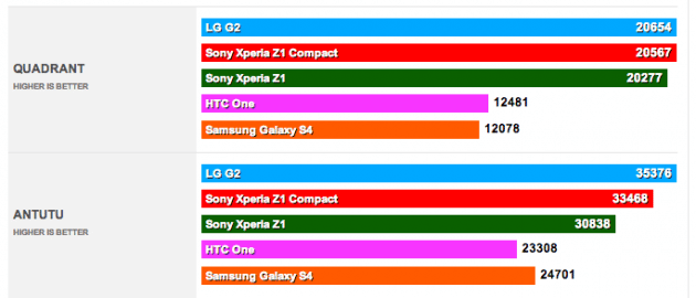 Le site PhoneArena a réalisé plusieurs benchmarks du tout nouveau Sony Xperia Z1 Compact afin d’évaluer les performances du même processeur (Snapdragon 800) que l’on trouve dans les Galaxy S4, LG G2 ou encore Xperia Z1. La différence ici est la définition d’écran qui de 720p contre 1080p pour les autres (sauf l’iPhone 5S).
