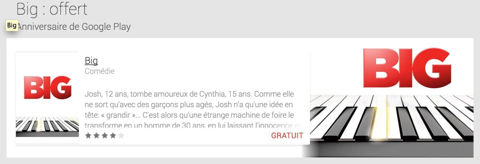 Mais ce n’est pas tout, le Play Store propose aussi un film gratuit : Big avec Tom Hanks dont le pitch est le suivant :