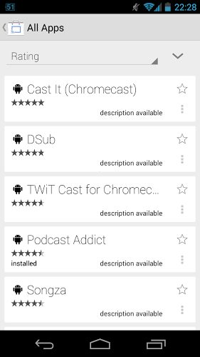 L’app gratuite Android du jour est Cast Store for Chromecast, une app qui répertorie les applications compatibles avec Chromecast. Si vous ne connaissez pas Chromecast, sachez qu’il s’agit d’une clé HDMI signée Google qui permet d’envoyer des flux vidéos, audio et photo sur une TV ou un moniteur équipé d’un port HDMI.