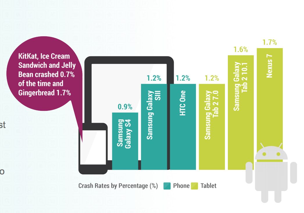 En effet, le service qui permet aux développeurs mobiles d’avoir des stats sur les crashs, ralentissements, requêtes, etc, travaille toutes ses données pour en faire ressortir les taux de crashs sur une plateforme. Si iOS 7.1 est plus stable qu’iOS 7, sachez qu’Android est bien plus stable que le premier cité.