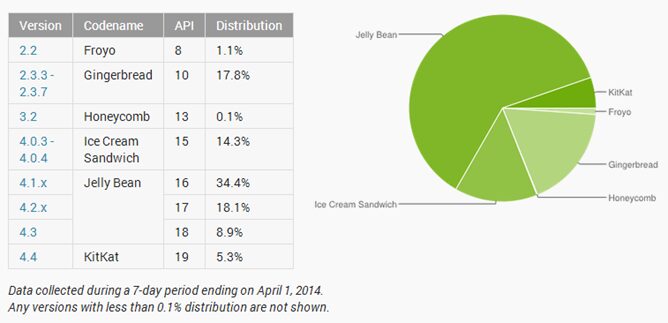 En analysant un peu les chiffres, on constate que Froyo est toujours stable, Gingerbread perd toujours du terrain et passe à 17.8% (-1.2%), que Ice Cream Sandwich perd lui aussi 0.9% pour arriver à 14.3% de part de marché, que Jelly Bean baisse pour la première fois (-0.6%), soit 61.4% de part de marché.