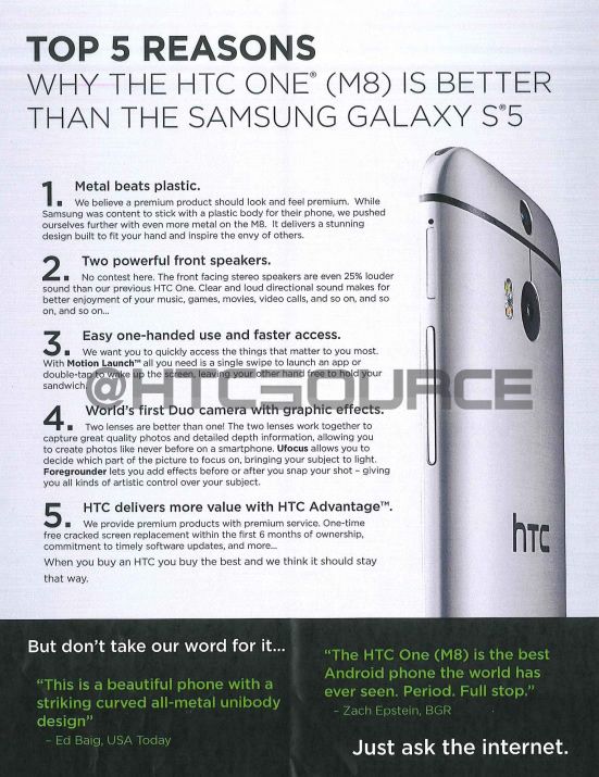 Si vous hésitez, peut-être que HTC peut vous aider. On sait par exemple que le HTC One a un meilleur écran mais que le S5 possède un meilleur appareil photo.