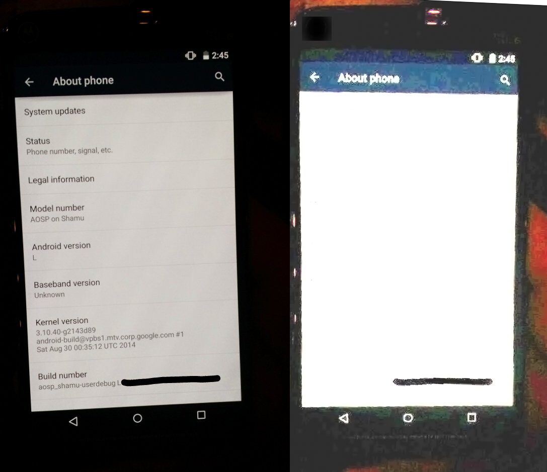 C’est l’écran « à propos du téléphone » qui est affiché sur lequel on peut lire que le Nexus Shamu tourne sur Android 5.0 L (évidemment) mais aussi que la version du kernel date du 30 Août. On peut imaginer que les tests sont donc bientôt finis et que le remplaçant du Nexus 5 sera présenté sous peu.