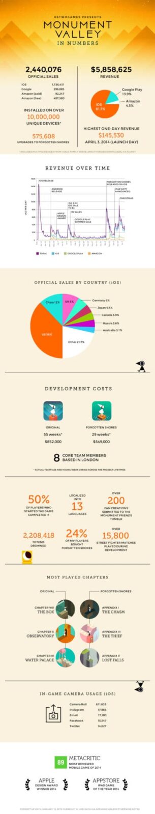 UsTwo, le studio de développement de l’excellent jeu Monument Valley, continue de nous donner des informations intéressantes sur le business du jeu vidéo. Aujourd’hui, c’est une belle infographie qui nous apprend que le jeu a coûté 852 000 dollars à réaliser, et a rapporté 5,8 millions de dollars.
