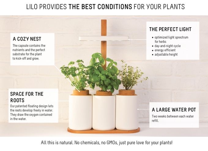 Finie la déception de voir son basilic acheté́ la veille mourir subitement… Intelligent et connecté, Lilo nourrit et fait pousser les aromates pendant plusieurs mois et permet de les consommer quotidiennement en cuisine.