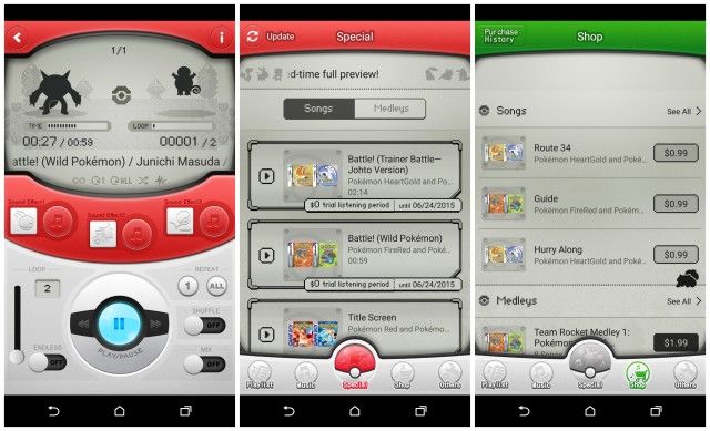 On retrouve pour l’instant des chansons en provenance de Pokémon Versions Rouge, Bleue, Rouge Feu, Vert Feuille, Or HeartGold et Argent SoulSilver. Pokémon X, Pokémon Y, Pokémon Rubis Oméga et Pokémon Saphir Alpha seront concernés par de prochaines mises à jour.