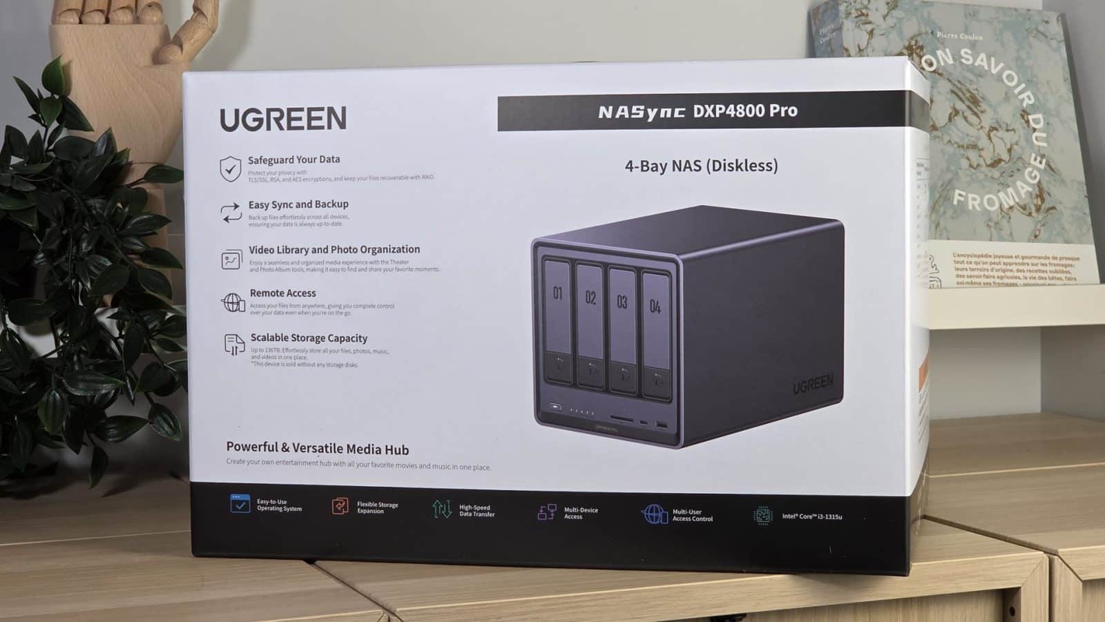 Dès le déballage, on comprend que le UGREEN NASync DXP4800 Pro n’est pas un simple boîtier de stockage. Le design est sobre, massif et sérieux. Les quatre baies sont accessibles en façade, avec un système propre et rassurant. Le format cube reste compact, mais inspire immédiatement confiance. Il trouve naturellement sa place sur un bureau, dans un studio ou dans un coin technique d’un appartement.